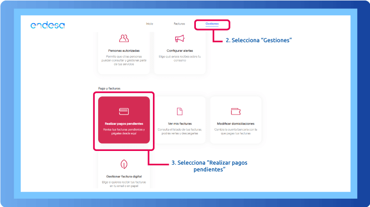 Puedes consultar las facturas pendientes de pago a través de Mi Endesa. En el área de clientes podrás ver el estado de cada uno de tus recibos, así como proceder al pago de todos aquellos que tengas pendientes.